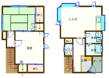 | 設備 | バス停近く、メゾネット、駐車場2台無料、角住居、出窓、ガスコンロ設置可、バストイレ別、追いだき機能付き、温水洗浄便座、洗面所独立、エアコン、都市ガス、玄関収納、床下収納、TVモニター付きインターホン | ||