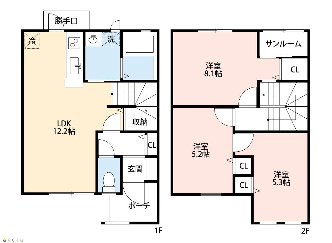 | 間取り | 3LDK (洋室:8.1、5.2、5.3) LDK12.2 ※洋室8.1帖にはサンルーム含む |