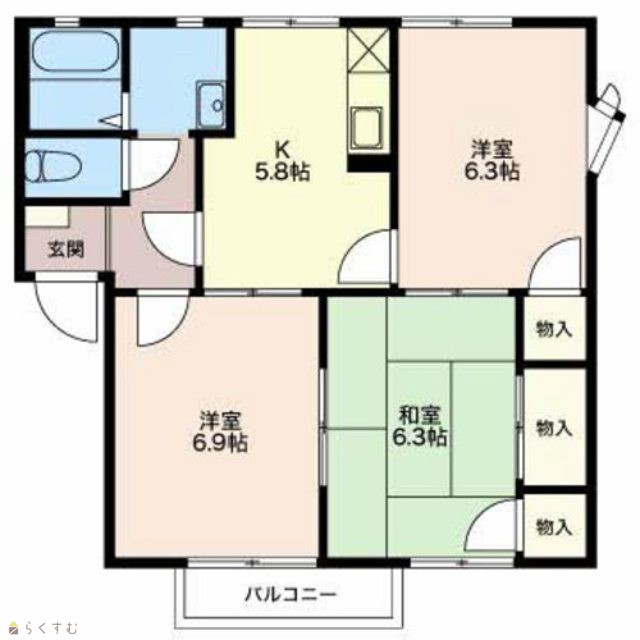 | 間取り | 3K (和室:6.3畳) (洋室:6.3、6.9) | ||