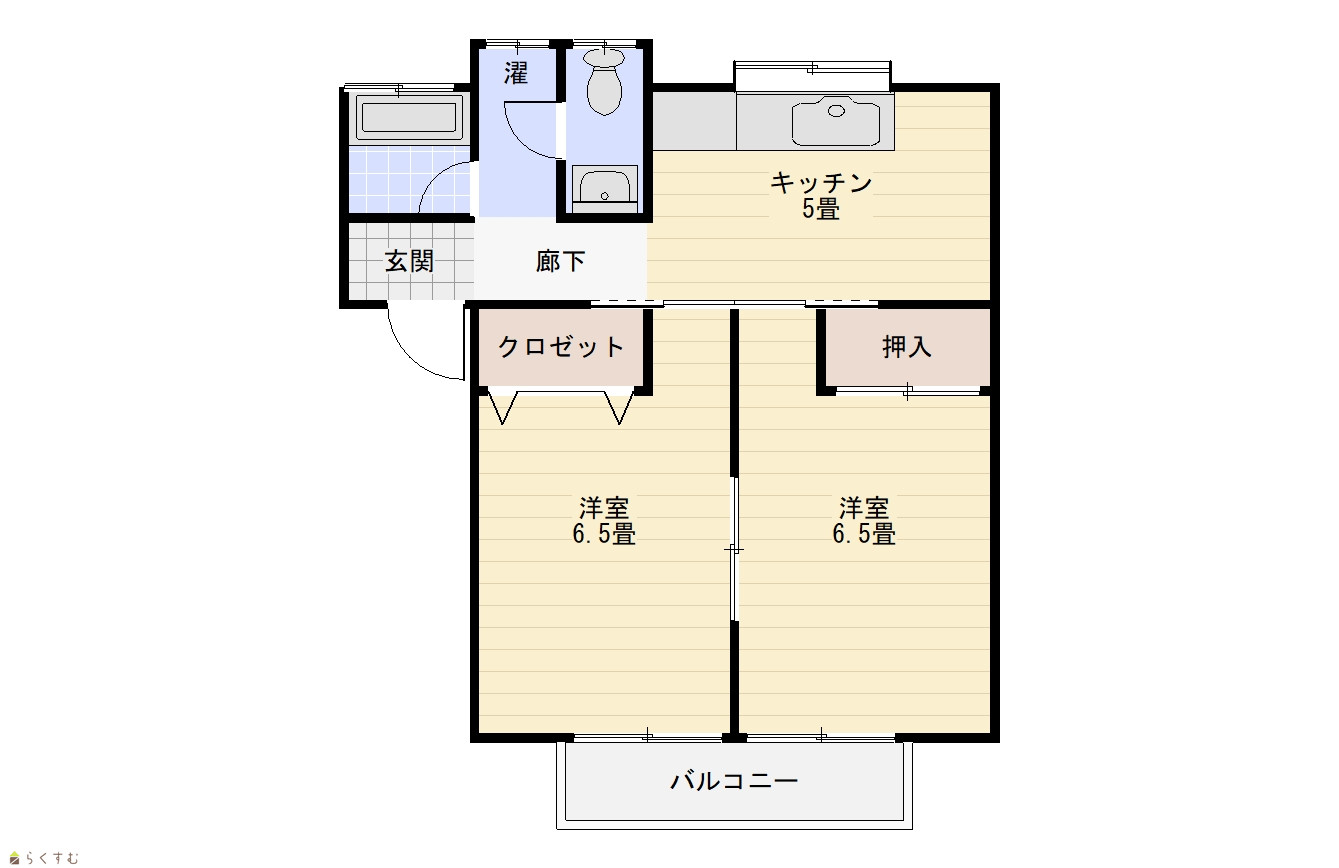 | 間取り | 2DK (和室:6畳) (洋室:6) DK6 B・T別室/水洗トイレ/洗濯機置場/ユニットバス/給湯/シャワー/エアコン |