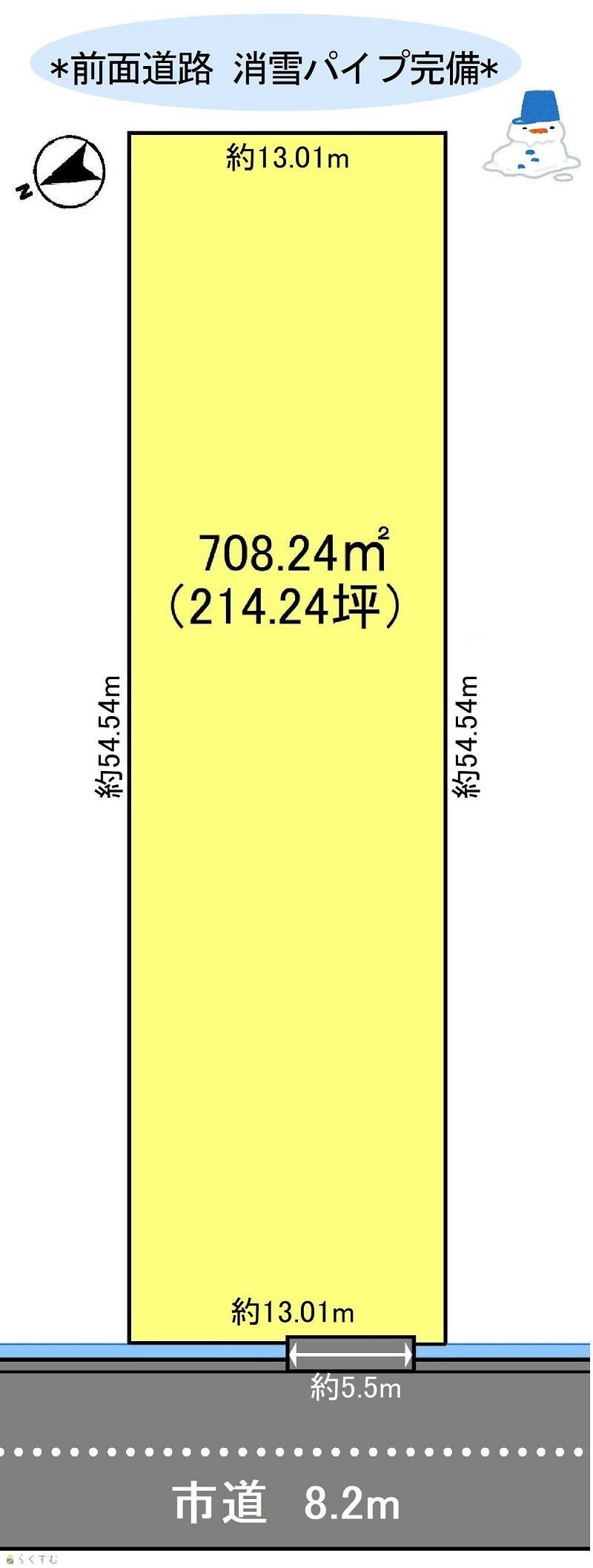 | 設備 | 前道6m以上、更地、学校近く、スーパー近く、建築条件なし、所有権、即引き渡し可、上水道(前面道路)、浄化槽、都市ガス(宅地内)、上水道(宅地内)、前面道路融雪設備あり | ||