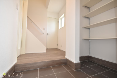 収納豊富な住まい♪洗面脱衣室の隣に物干場を配置した家事ラク動線!3台並列駐車可能♪シューズクローク有