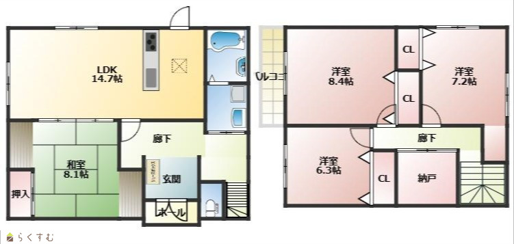4LDK (和室:8.1畳) (洋室:8.4、7.2、6.3) 14.7 |