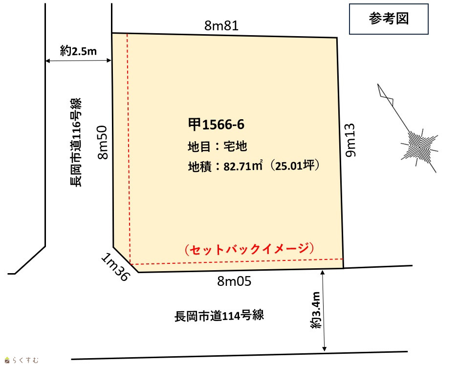 | 形状 | 間口 8.0m × 奥行 8.5m | 道路 | 南:長岡市道114号線/西:長岡市道116号線 |