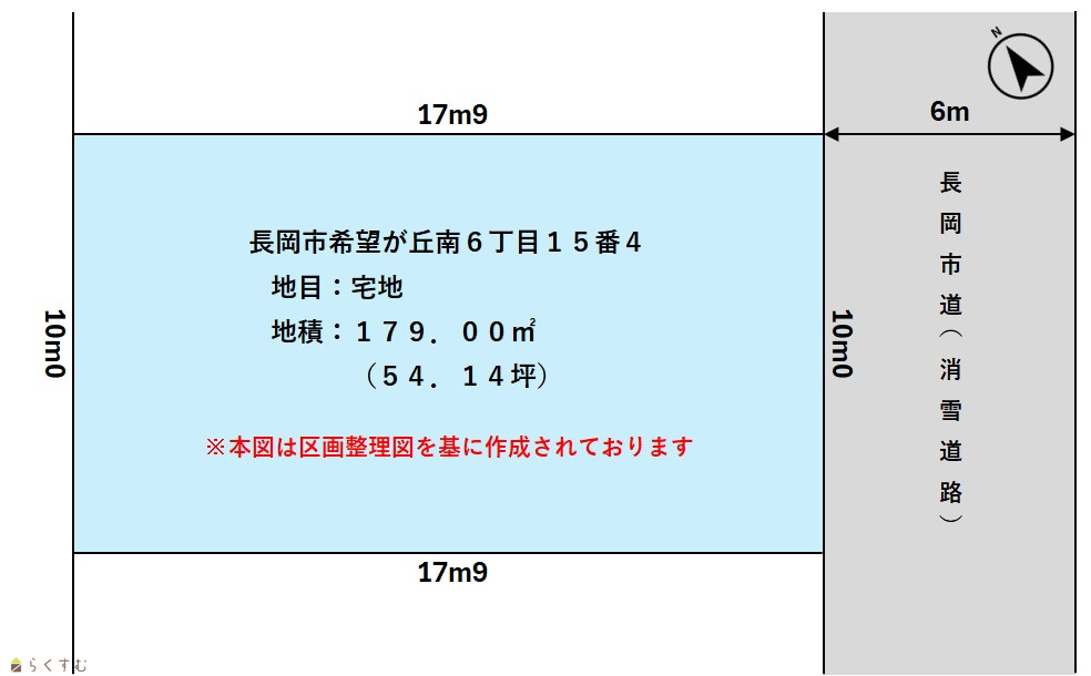 | 形状 | 間口 10m × 奥行 17.9m | 道路 | 長岡市道 幅員約6m(消雪道路) |