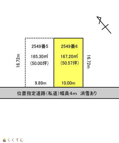 | 形状 | 間口 10.00m × 奥行 16.72m | 道路 | 南西側 位置指定道路(私道)幅員4m 消雪あり |