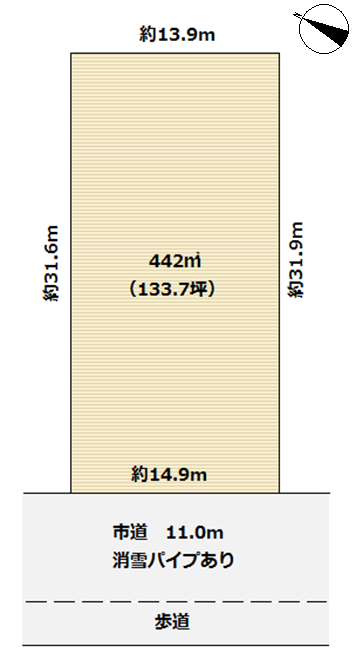 | 形状 | 間口 14.9m × 奥行 31.6m | 道路 | 市道11m 消雪パイプあり |