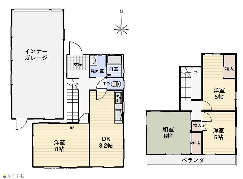 4DK (和室:8畳) (洋室:8、5、5) DK8.2 |