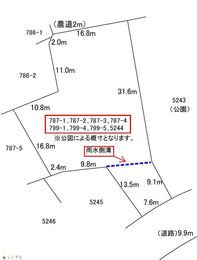 | 備考 | 土地確定測量は売主負担で行います。(令和8年春頃予定)/敷地内に雨水側溝が存在します。/農地法届出は弊社にて無料で行います。/下水受益者負担金が敷地の一部で賦課されます。(約17万円) | ||