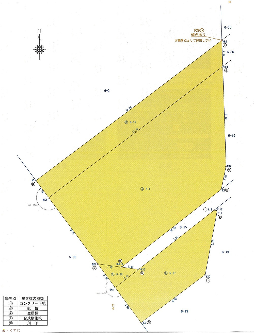 | 備考 | ・土地面積は実測面積です。 ・土地地番は合計4筆(6番1、6番16、6番37、6番38)になります。 ・6番37、6番38の登記地目は公衆用道路になります。 ・建築確認申請の際は土地面積全て(公衆用道路部分も含む)が敷地面積に算入できます。 ・敷地の一部に水路が通っています。 |