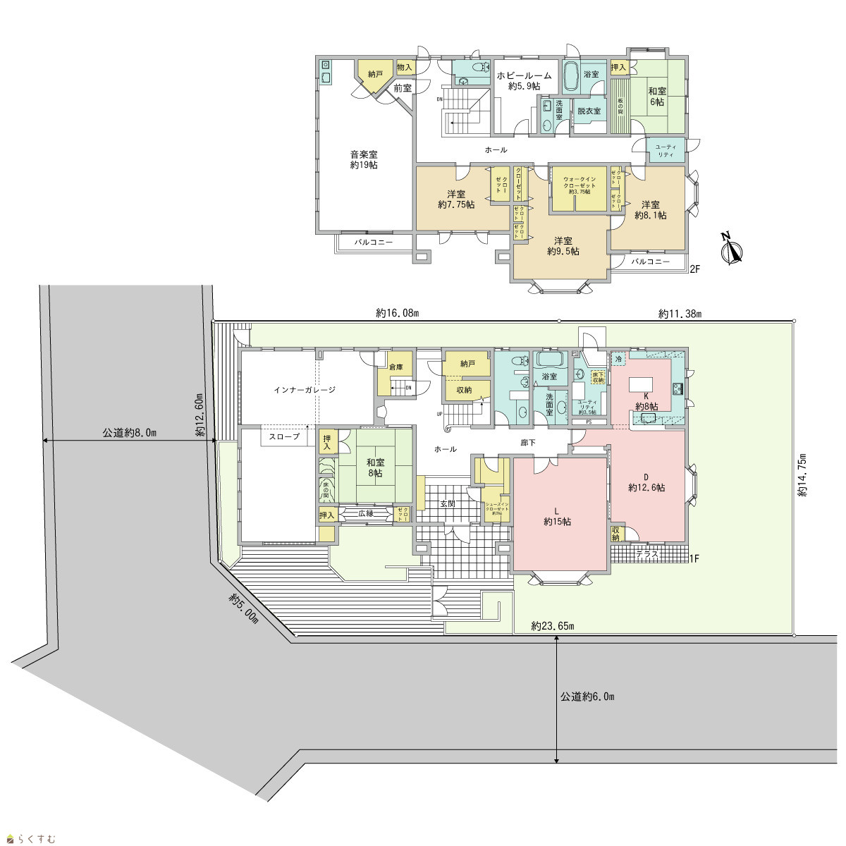 5LDK (和室:8畳、6畳) (洋室:9.5、8.1、7.75) L15 D12.6 K8 音楽室19帖、ホビールーム5.9帖、納戸あり |