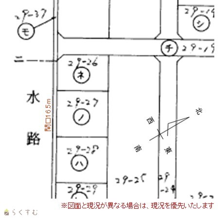 | 設備 | 整形地、前道6m以上、更地、スーパー近く、建築条件なし、所有権、側溝、電気、都市ガス(宅地内)、上水道(宅地内)、下水道(宅地内)、住宅向け | ||