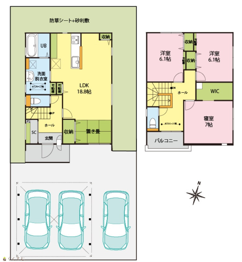 3LDK (洋室:7、6.1、6.1) LDK18.8 |