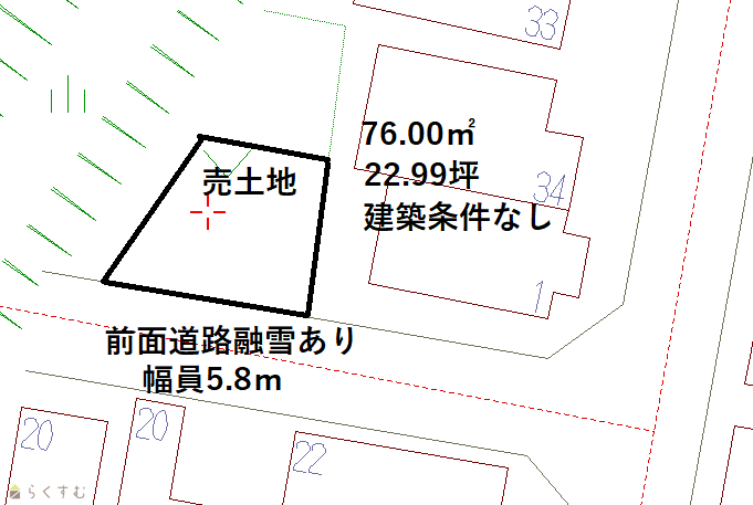 | 設備 | 角地、南側道路面す、学校近く、閑静な住宅街、建築条件なし、所有権、都市ガス(前面道路)、上水道(前面道路)、下水道(前面道路)、前面道路融雪設備あり | ||