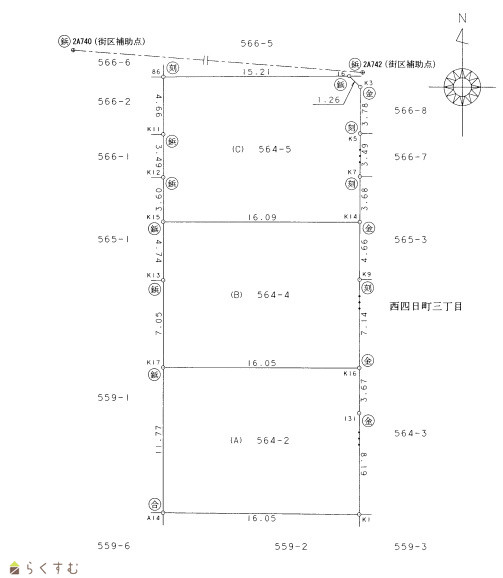 | 形状 | 間口 11.86m × 奥行 16.05m | 道路 | 北側 公道 約4m 東側 公道 約4m |