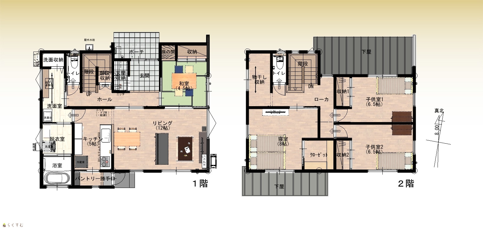 | 建物面積 | 1階 68.94㎡/ 2階 57.76㎡/ 計 126.7㎡ /38.32坪 | ||