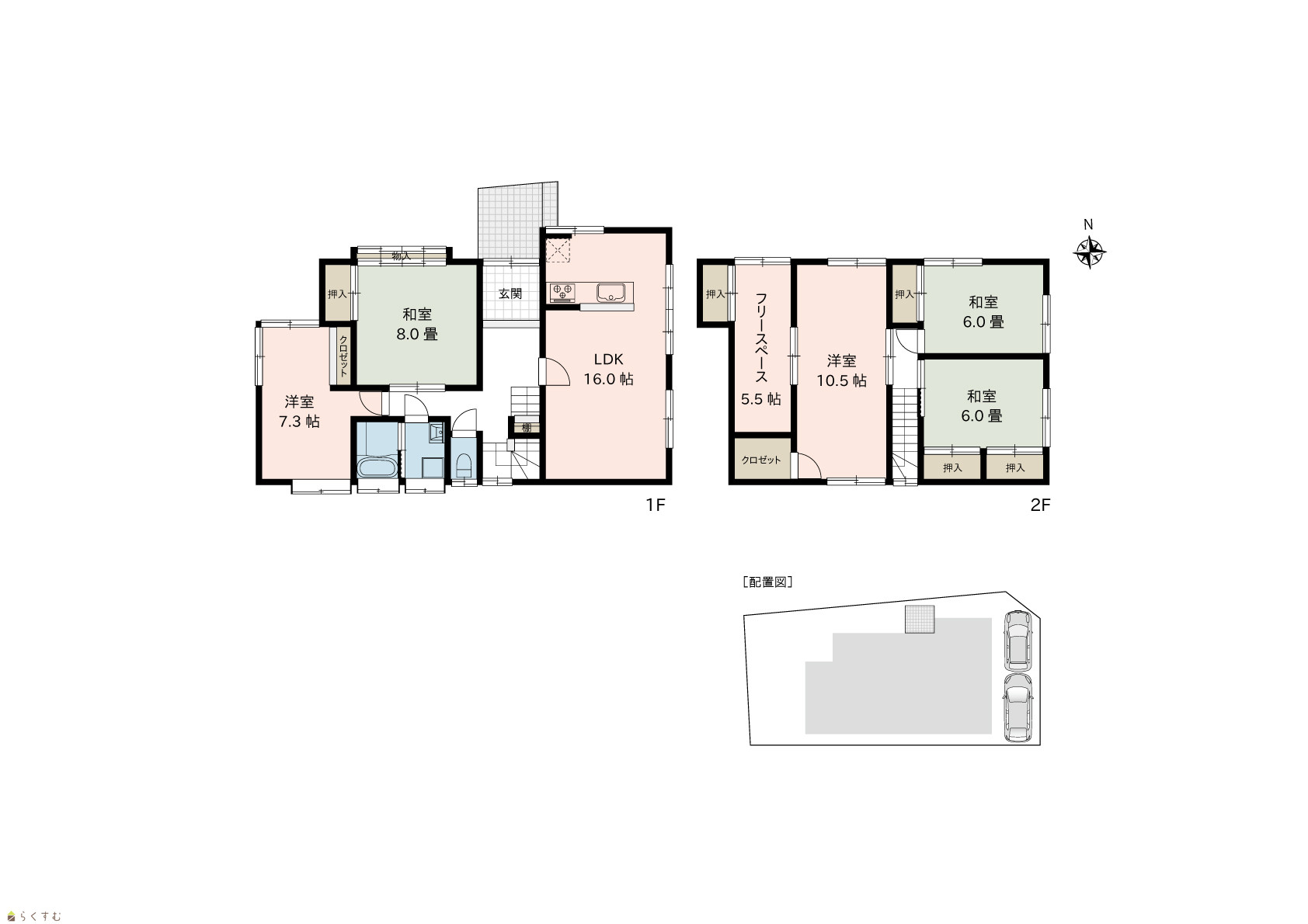 5LDK (和室:8.0畳、6.0畳、6.0畳) (洋室:7.3、10.5) LDK16.0 |