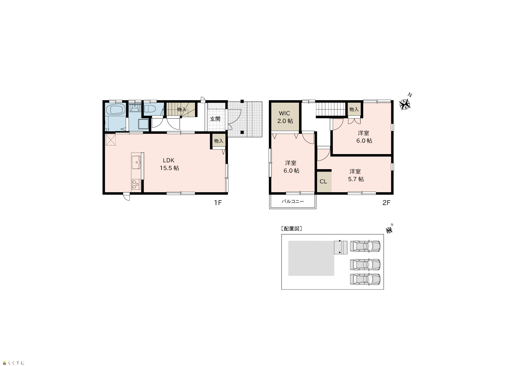 3LDK (洋室:6.0、6.0、5.7) LDK15.5 |