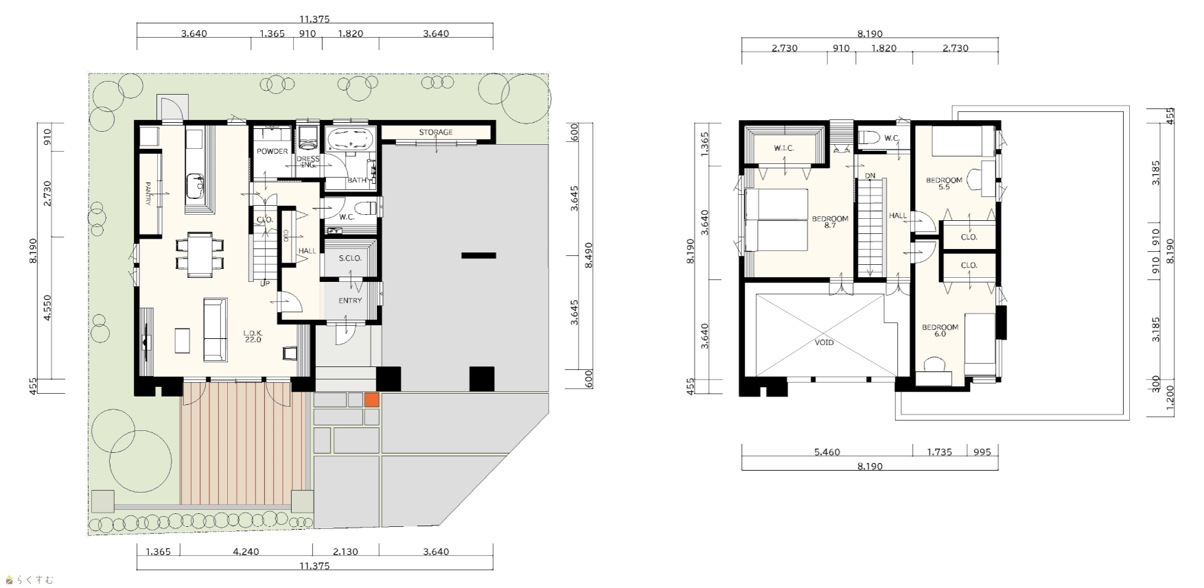 3LDK (洋室:8.7、6.0、5.5) (LDK 22.0) インナーガレージ 28.71㎡(8.68坪) |