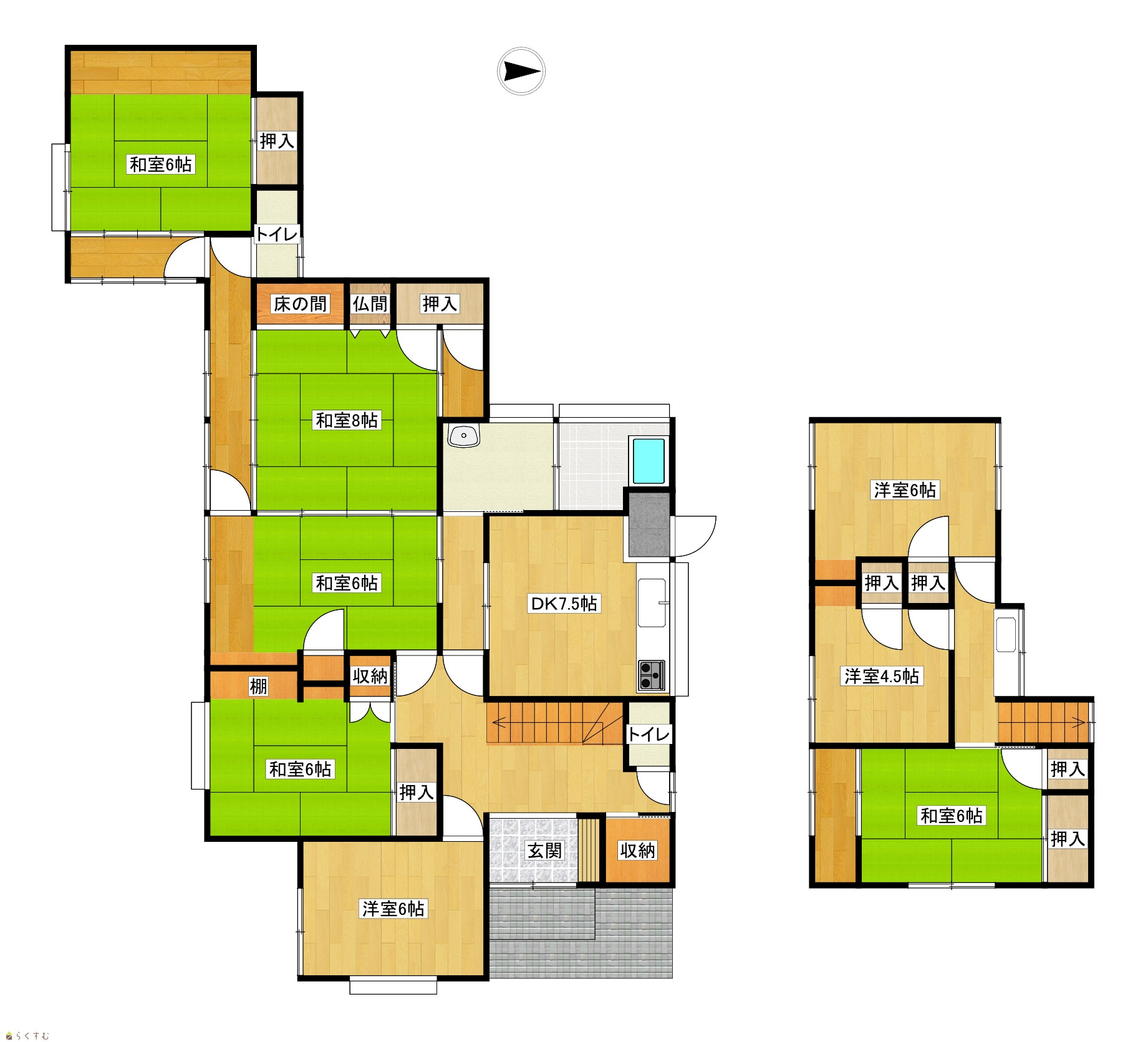 8DK (和室:8畳、8畳、6畳、6畳、6畳) (洋室:6、6、4.5) DK7.5 未登記建物【附属家】16.52㎡と【附属家】14.87㎡が別途あります |