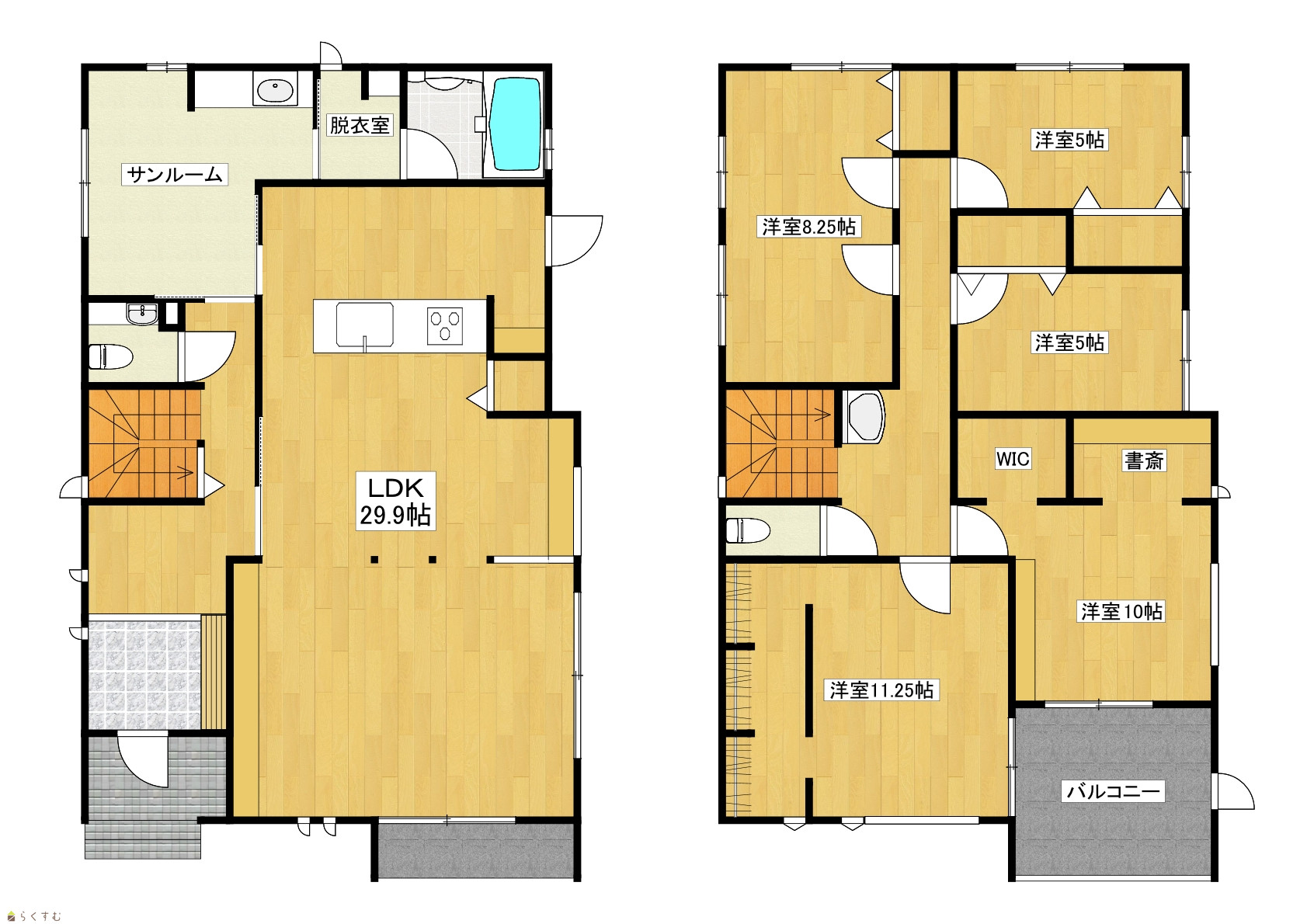 5LDK (洋室:11.25、8.25、10、5、5) LDK29.9 サンルームあり |