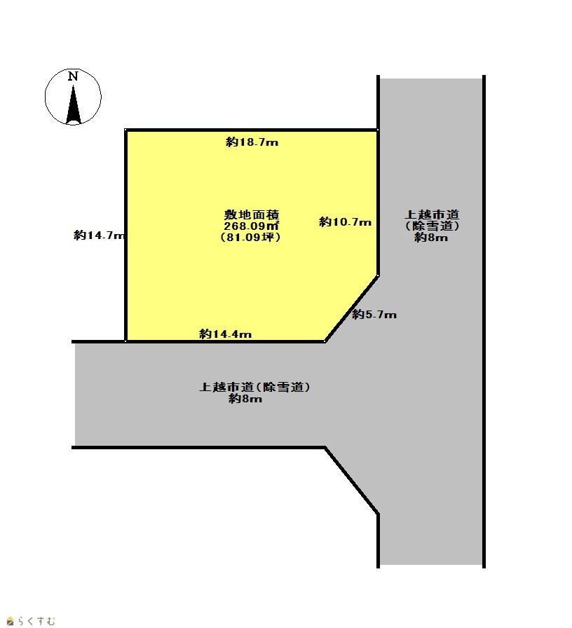 | 形状 | 間口 18m × 奥行 14m | 道路 | 南側及び東側8m(上越市道、除雪道) |