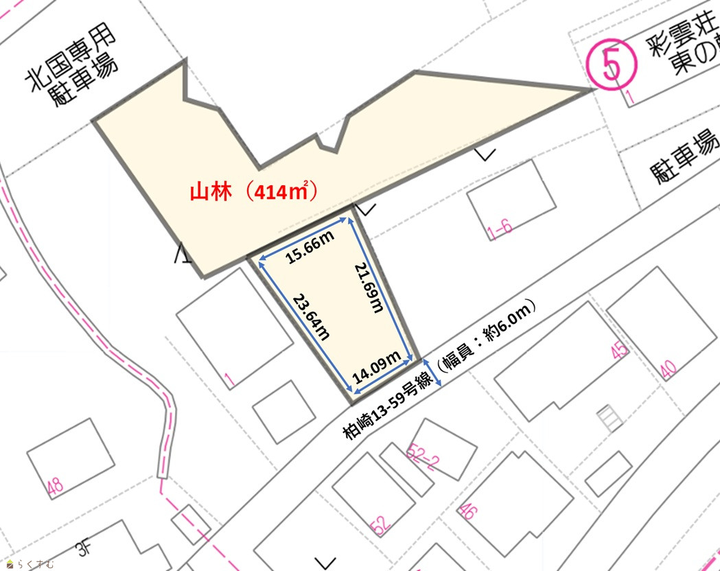 | 形状 | 間口 14.09m × 奥行 21.69m | 道路 | 南東側:柏崎13-59号線(幅員6.0m) |