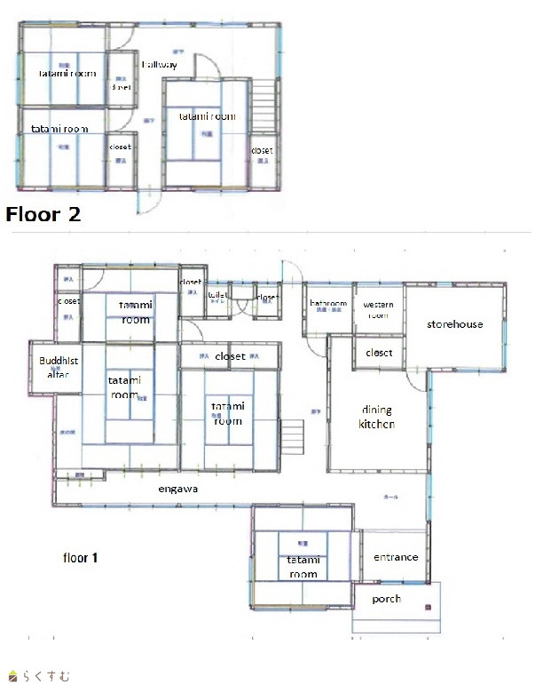 | 備考 | Room for 3 cars/ vegetable garden/ corner lot/ good sunlight exposure/ bath reheating function/ LPG/ water supply and drainage/ underfloor storage/ available for immediate occupancy/ handover as it is/ access to groceries - Exclusive residence and accompanying buildings are not registered, so the seller will handle the registration at their expense and deliver the property. - In addition to the exclusive residence, there are two accompanying buildings: one built in 1978 (lightweight steel frame, 55.80㎡) and one built in 1987 (wooden, 14.90 ㎡). - Other costs include contract stamp duty and ownership transfer fees. |