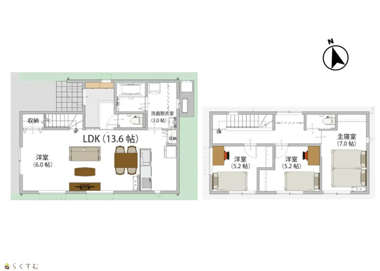 4LDK (洋室:7、6、5.2、5.2) LDK13.6 土間収納、パントリー、サンルーム、洗面室3帖あり |