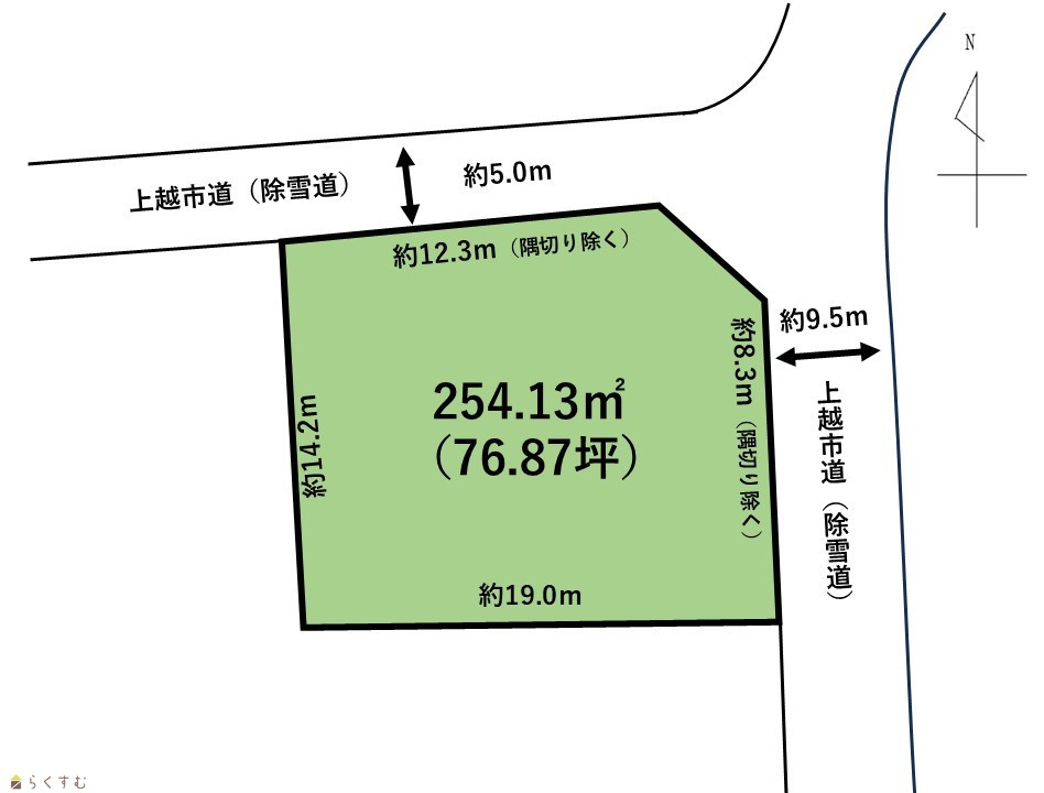 | 形状 | 間口 12.3m | 道路 | 北側:公道約5m 除雪道、東側:公道約9.5m 除雪道 |
