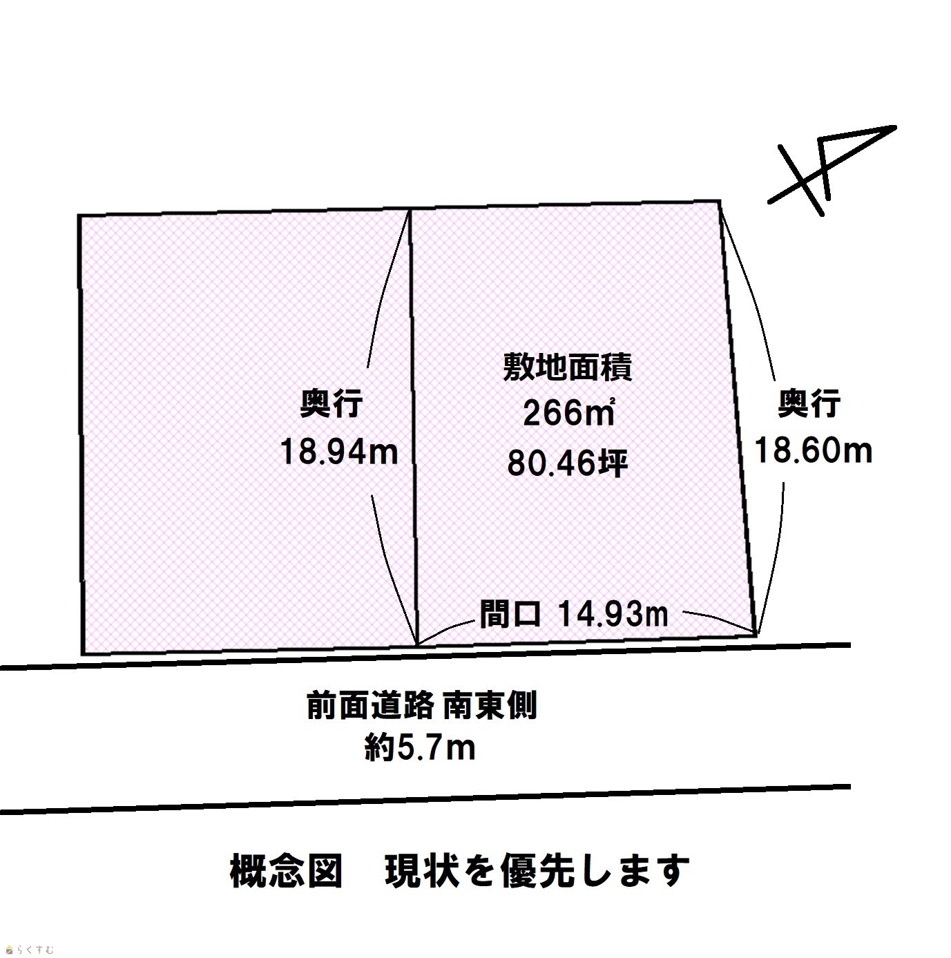 | 形状 | 間口 14.9m × 奥行 18.9m | 道路 | 南東側約5.7m |