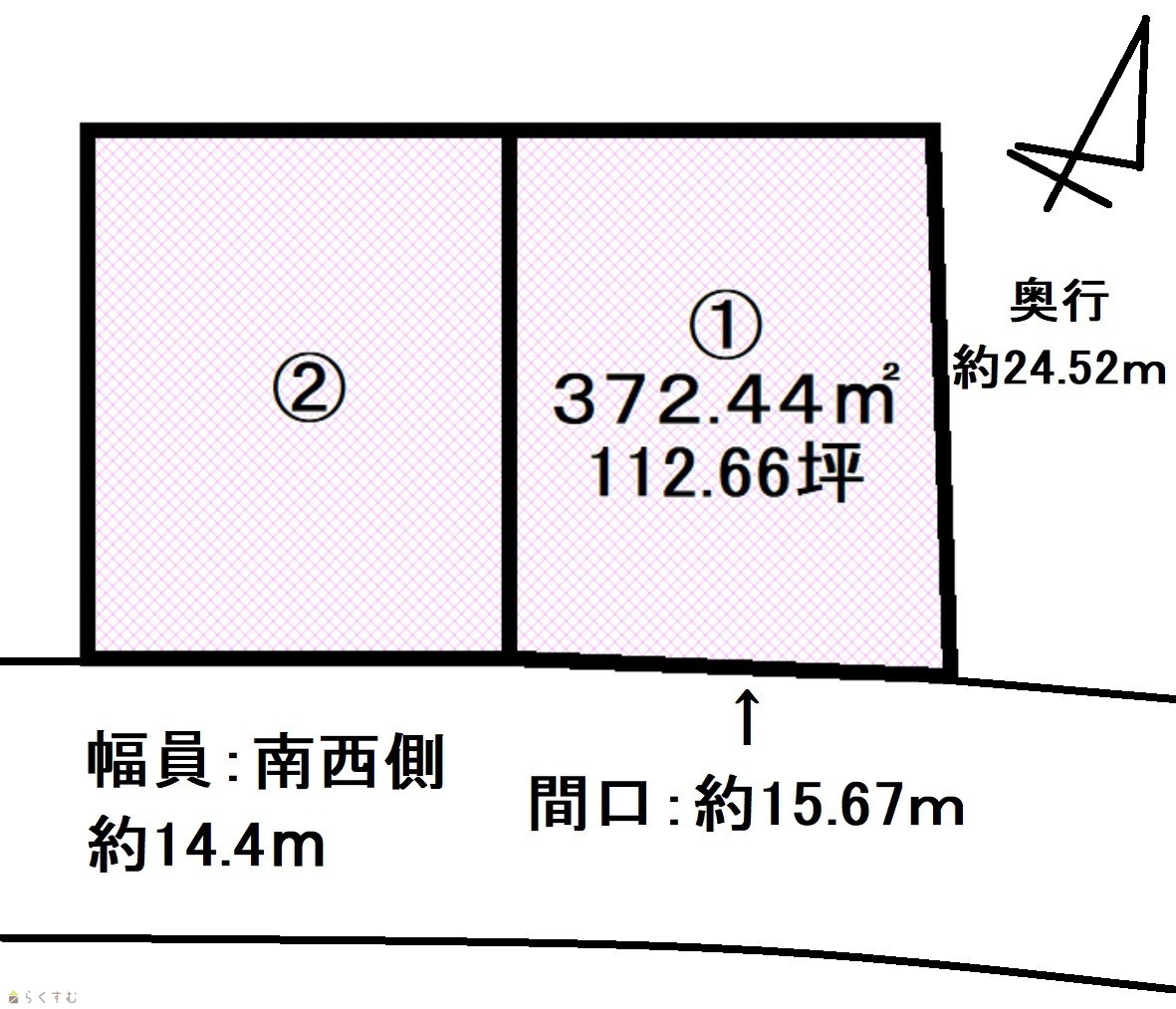 | 形状 | 間口 15.6m × 奥行 24.5m | 道路 | 南西側約14.4m |