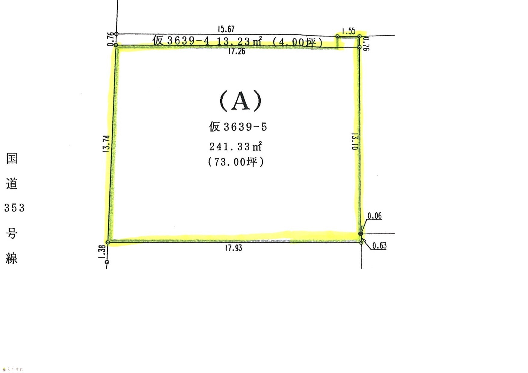 | 形状 | 間口 13.7m × 奥行 17.2m | 道路 | 西:国道353号線 |