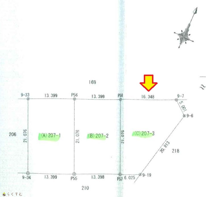 | 形状 | 間口 16.34m × 奥行 21.07m | 道路 | 北側6.9m 東側6.8m |
