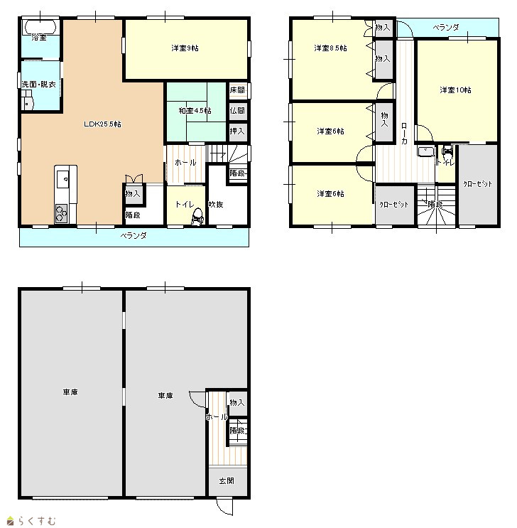 6LDK (和室:4.5畳) (洋室:10、9、8.5、6、6) LDK25 |