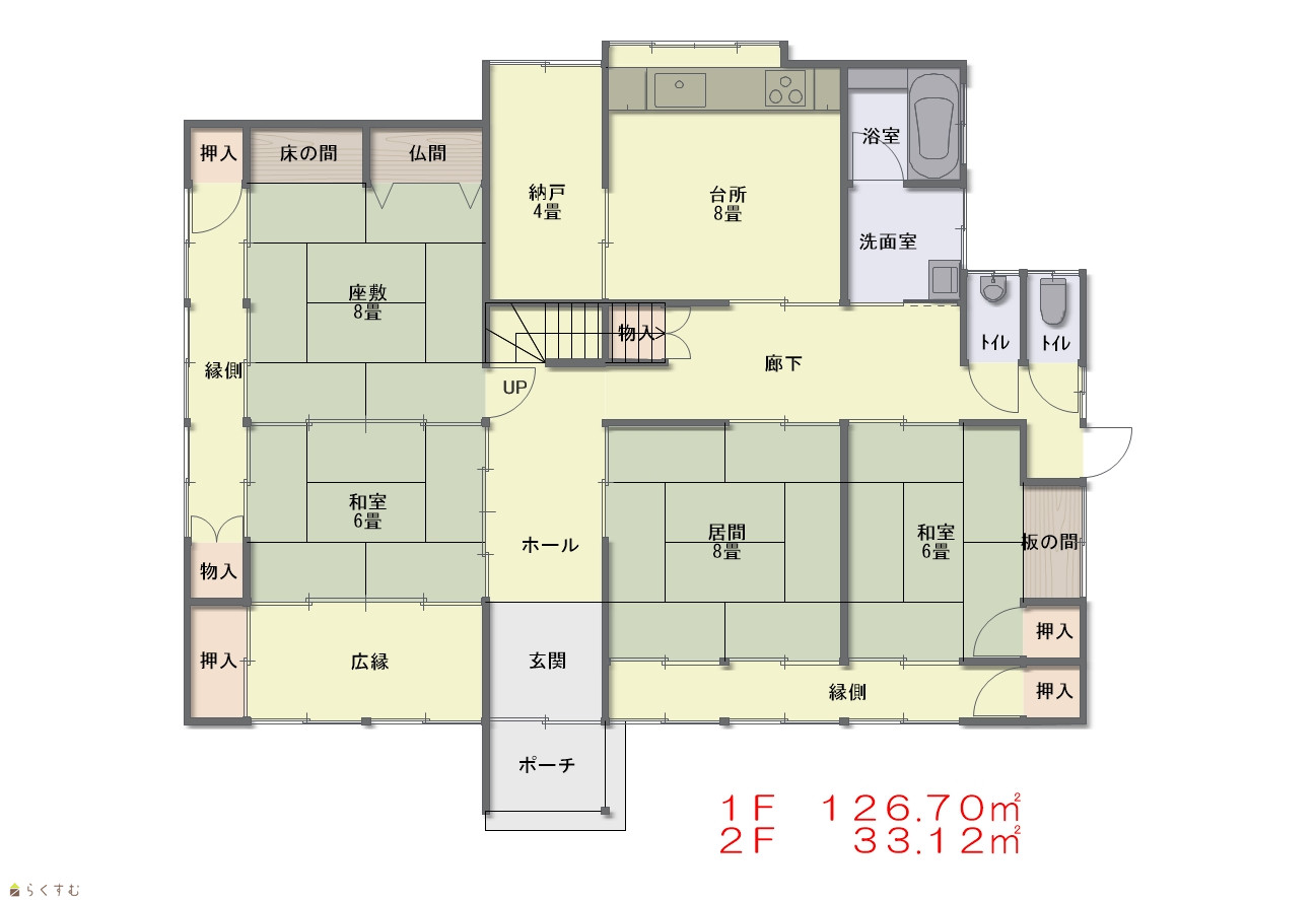 | 建物面積 | 1階 126.7㎡/ 2階 33.12㎡/ 計 159.82㎡ /48.34坪 | ||
