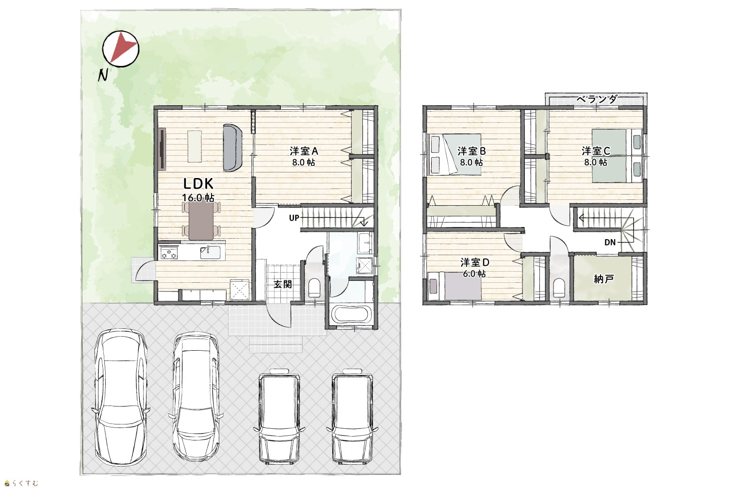 4LDK (洋室:8、8、8、6) LDK16 納戸有 |