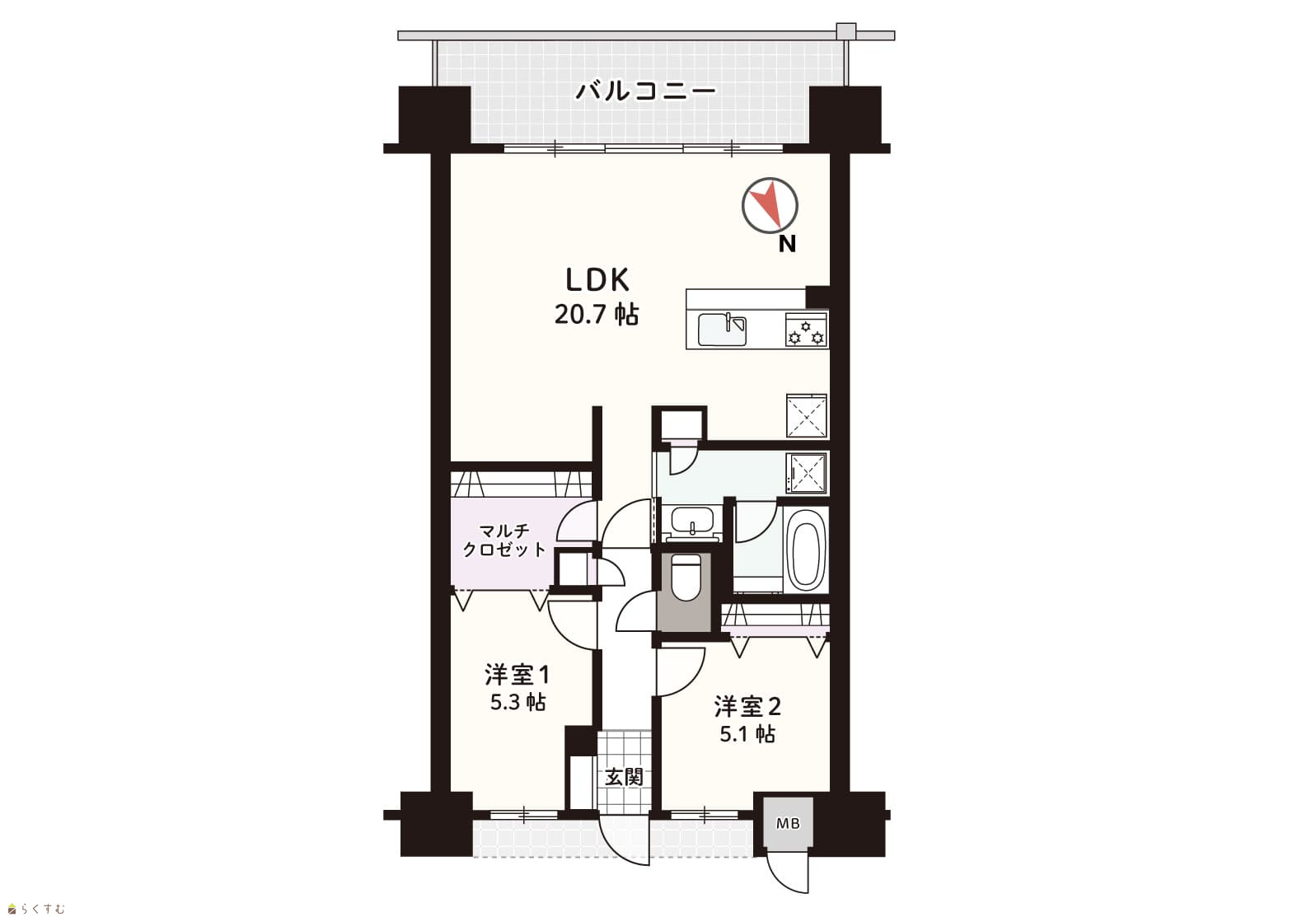 2LDK (洋室:5.3、5.1) LDK20.7 |