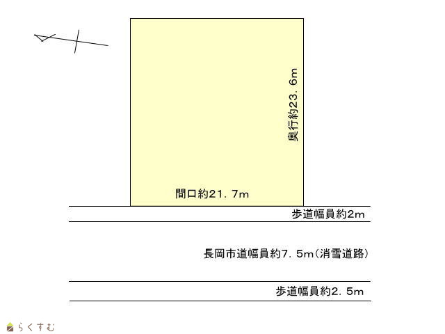 | 形状 | 間口 21.7m × 奥行 23.6m | 道路 | 南西長岡市道幅員12m(消雪あり) |