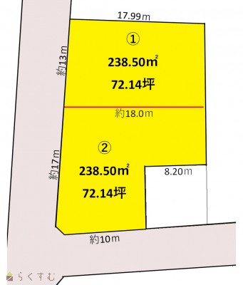 | 設備 | 角地、前道6m以上、南側道路面す、更地、学校近く、スーパー近く、閑静な住宅街、分割可能、建築条件なし、所有権、即引き渡し可、都市ガス(前面道路)、上水道(前面道路)、下水道(前面道路)、前面道路融雪設備あり | ||