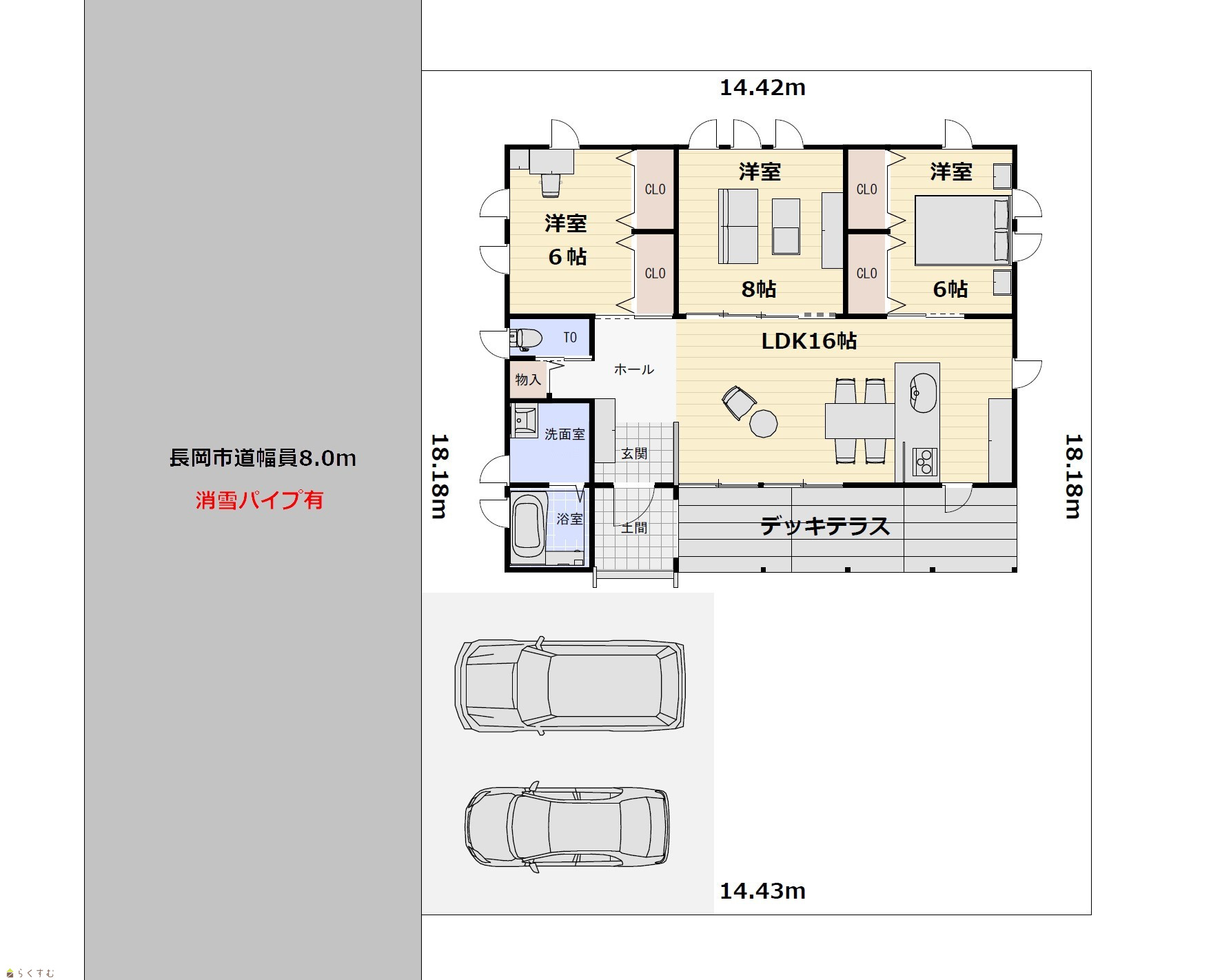 | 形状 | 間口 18.18m × 奥行 14.43m | 道路 | 長岡市道幅員8.0m 前面道路消雪パイプ有 |