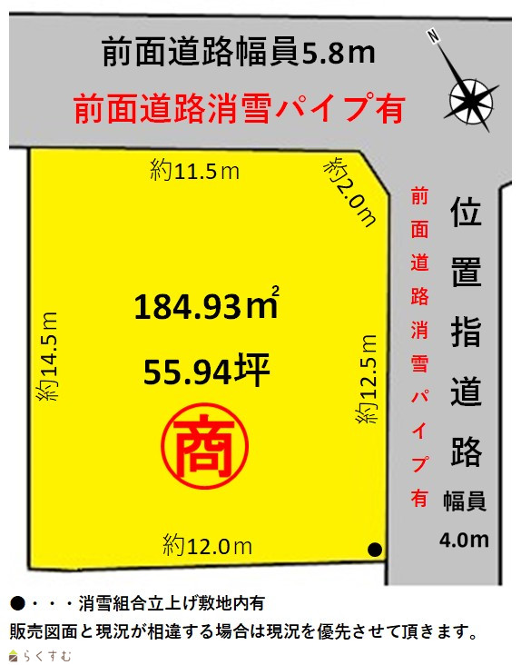 | 形状 | 間口 13.5m × 奥行 14.5m | 道路 | 長岡市道幅員5.8m、位置指定道路幅員4.0m 消雪パイプ有 |