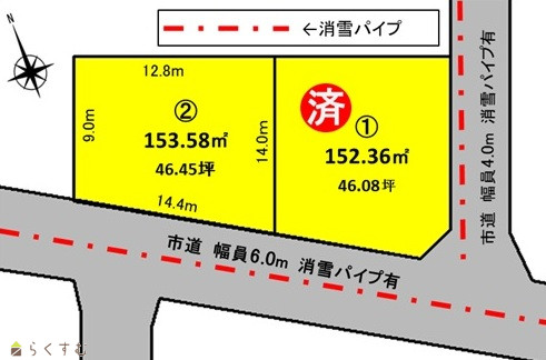 | 備考 | ・区画2:下水道引込済み。上水道、都市ガスは前面道路より引込可。 ・販売図面と現況が相違する場合は現況を優先させて頂きます。 ・物件詳細についてはお問合せ下さい。 |