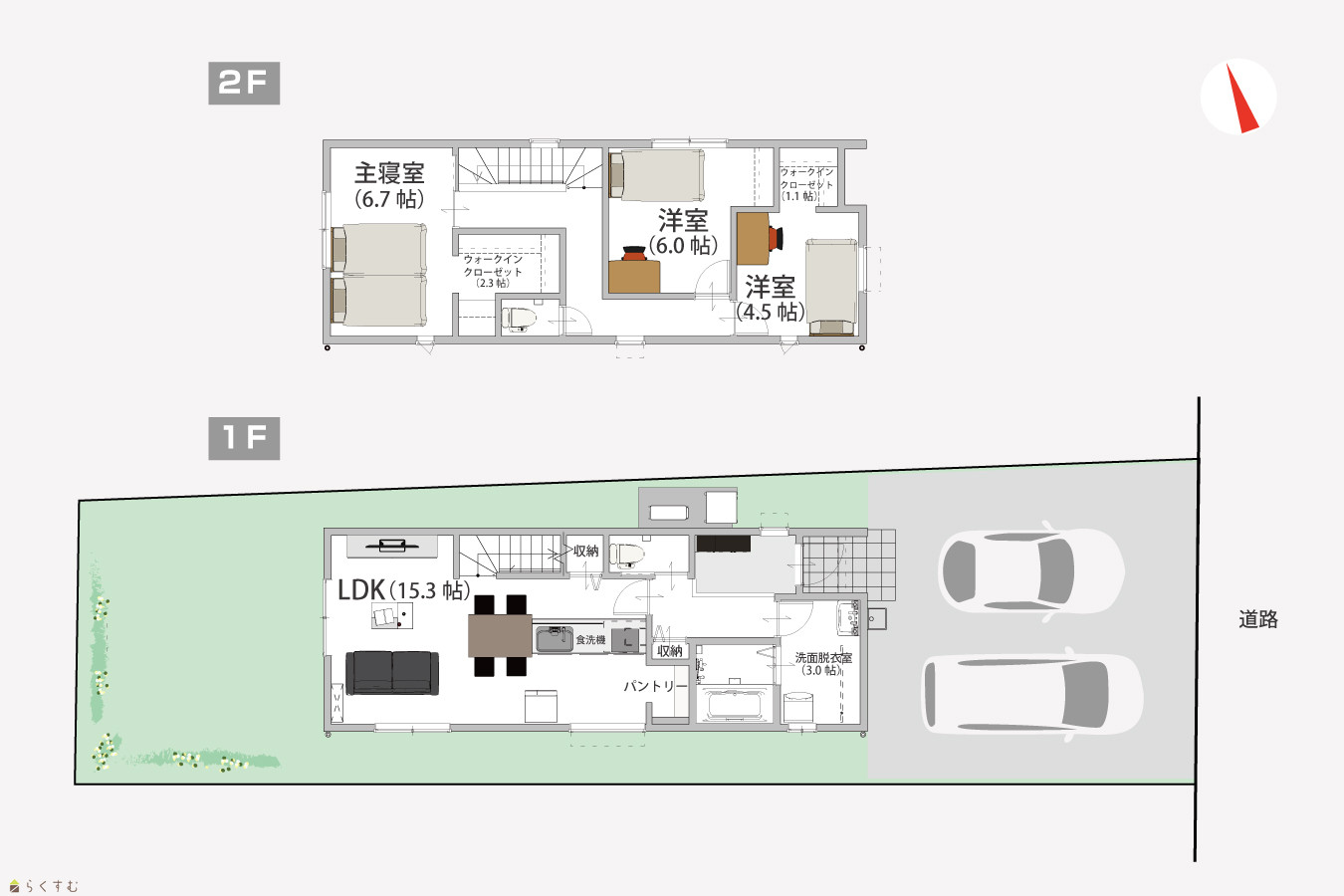 3LDK (洋室:6.7、6.0、4.5) LDK15.3帖 洗面脱衣室3.0帖、ウォークインクローゼット2.3帖、1.1帖 |