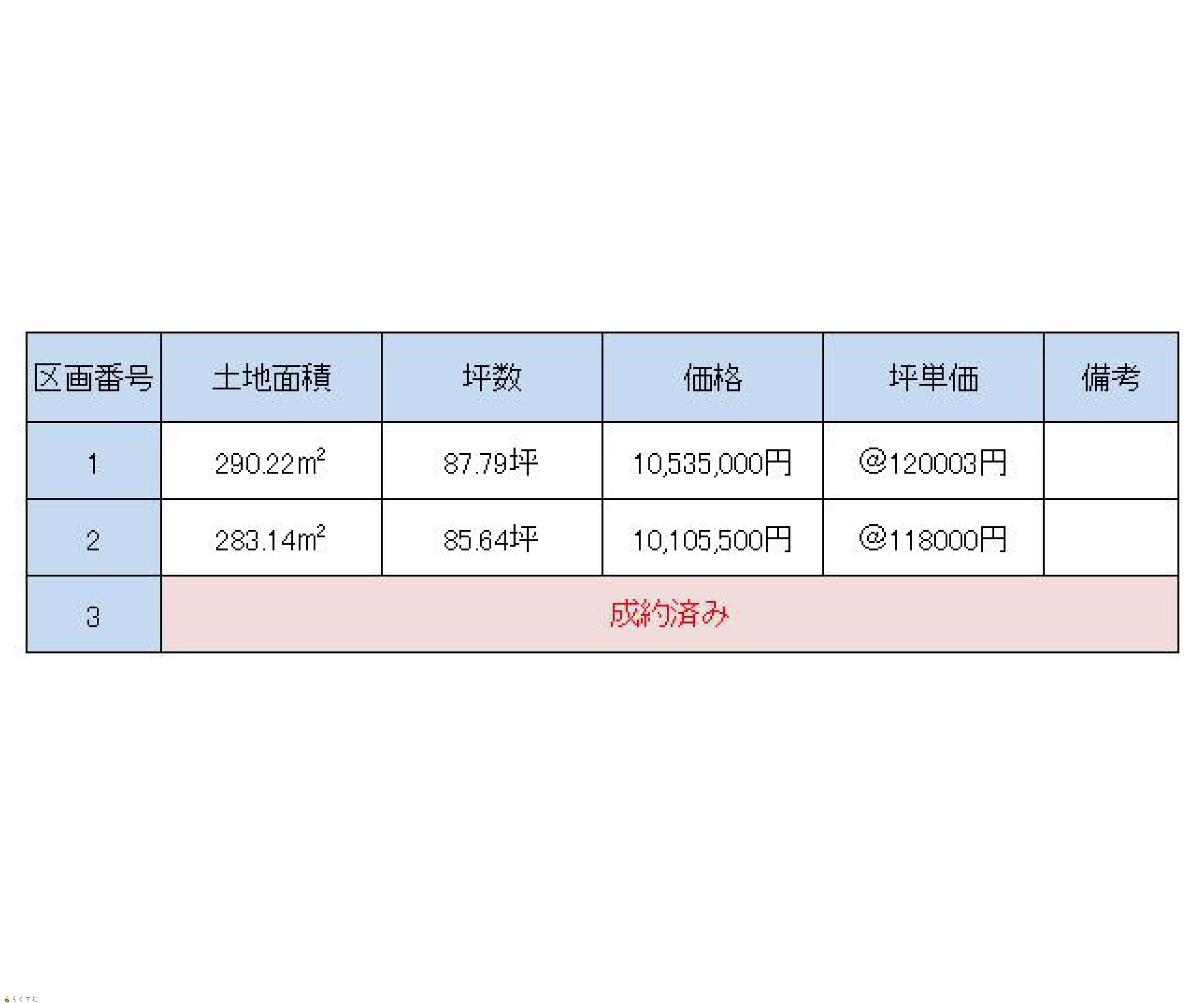 | 備考 | ・ハーバーハウス株式会社の建築条件付きです。 ・仲介手数料が発生します。 ・水道引込は買主負担 ・受益者負担金支払い済み、公共マス設置は長岡市負担 |