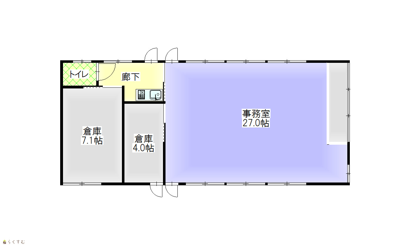 | 間取り | 事務室(洋間約27帖)、倉庫(約7帖)、倉庫(約4帖) | ||