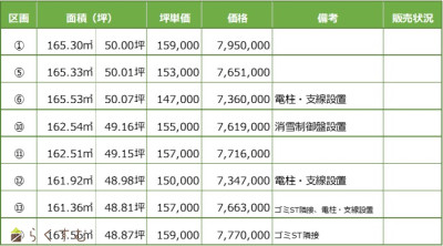 | 備考 | ・ゴミST隣接区画および電柱・支線・消雪制御盤のある区画は各50,000円を表示価格より値引き ・消雪設備負担金有:1区画あたり200,000円、消雪会費:年額5,000円 ・区画図内水路は全区画の共有 ・⑤区画は電線引込時、建築物の建築位置等により先方柱の設置可能性有、①・⑨・⑬・⑭区画は都市計画道路(3.5.26石上興野線)にかかるため、建物建築時に許可申請要 ・下水道未整備地域のため、買主負担にて浄化槽設置要 ・仲介手数料有:300,000円+消費税10% |