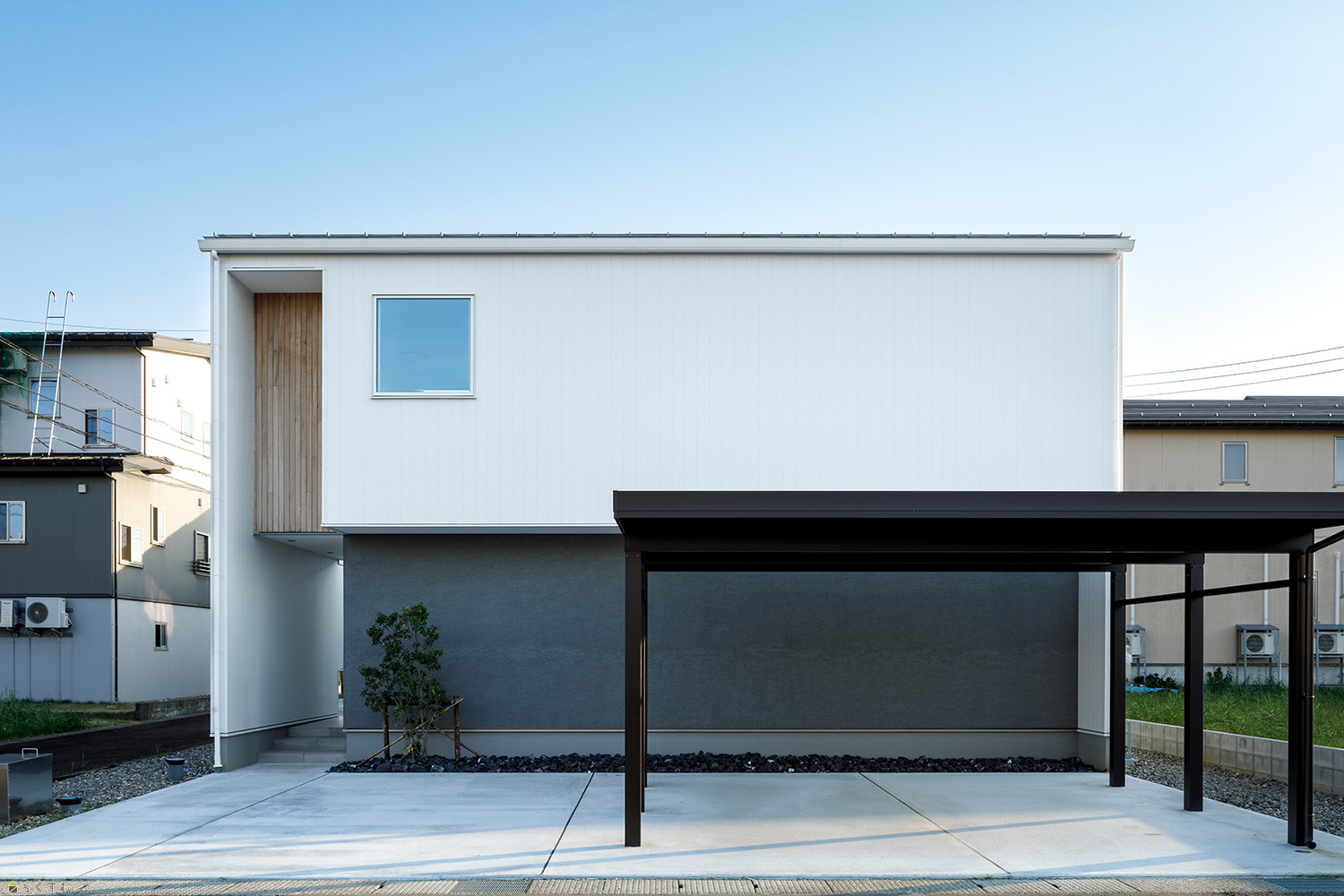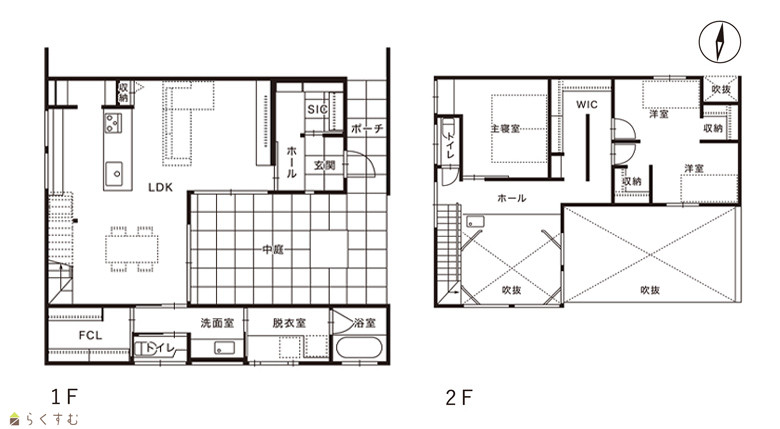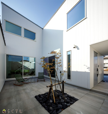 | 備考 | 周辺の住宅環境を考え視線を遮りプライベートな日常の確保を意識したコの字設計。 アプローチとつながる広々とした中庭は、プライベートだけでなくゲストたちを集めて楽しく過ごせるパブリックな空間として利用できる。 パブリックスペースから水回りや収納といった生活感を伺えないように設計。 大開口の窓によりリビング・ダイニング・キッチン・中庭のどこにいても視線が抜ける。 2Fホールのスタディスペースからは広く空が見えるように窓を配置し開放的な空間に。 |