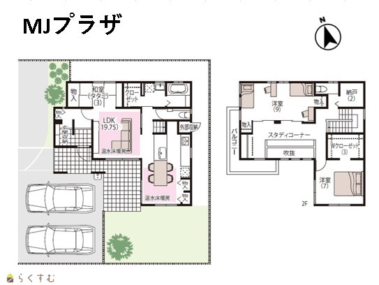 3LDK (和室:3畳) (洋室:9、7) LDK19.7 スタディコーナー2階、Wクローゼット3帖2階、納戸2帖2階 |