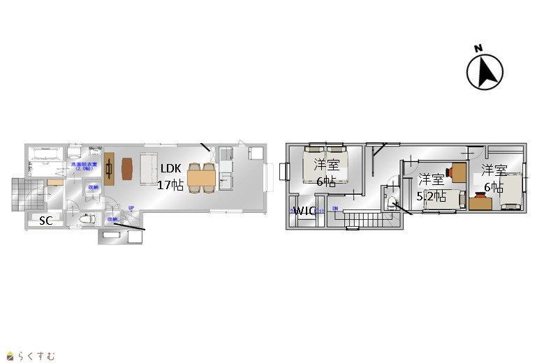 3LDK (洋室:6、6、5.2) LDK17 土間収納、WIC2帖、洗面室2帖あり |